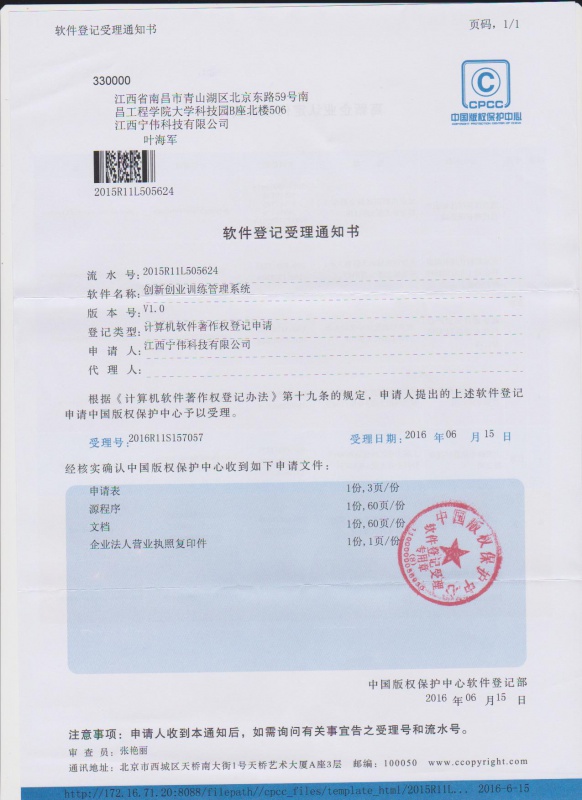南昌市科技和信息局于2016年06月31日對我公司的《科研項目管理系統(tǒng)》軟件產(chǎn)品進行審核,經(jīng)審核,申報材料和相關(guān)內(nèi)容符合《鼓勵軟件產(chǎn)業(yè)和集成電路產(chǎn)業(yè)發(fā)展的若干政策》和《軟件產(chǎn)品管理辦法》的有關(guān)規(guī)定,予以登記并頒發(fā)軟件產(chǎn)品登記證書。